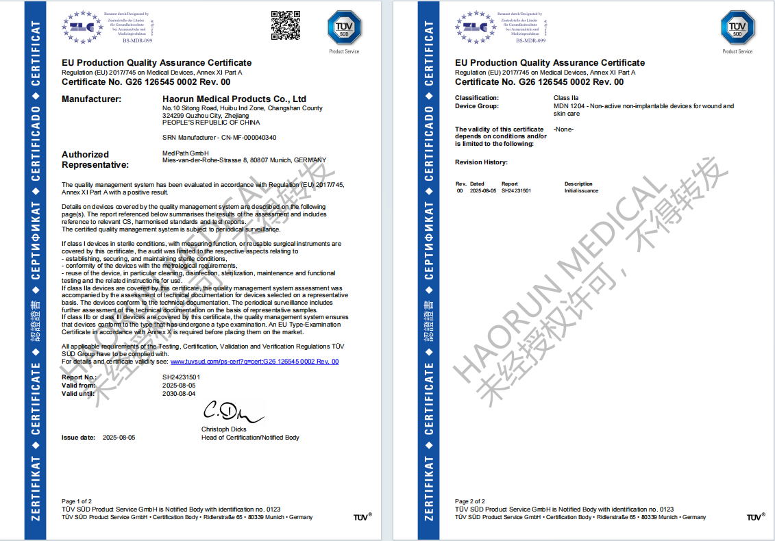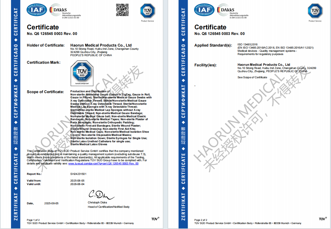 Chun feabhas breise a chur ar an gcáilíocht, chríochnaíomar foilsiú ár ndoiciméad Lámhleabhar agus Nós Imeachta Cáilíochta i Meán Fómhair 2023. Bunaithe ar seo, chuireamar feabhas ar ár ndoiciméid chórais bainistíochta cáilíochta i mí Eanáir 2024, ag cur ábhar a bhaineann le MDR leis. Rith muid an chéad chéim den iniúchadh Tuv Sud ar 10 Aibreán, 2025, agus ansin an dara céim. Mar fhocal scoir, i mí Lúnasa na bliana seo, bhí ár n -uimhir deimhnithe ar fáil le breathnú orthu i gcóras an chomhlachta fógra, ag marcáil céim nua chun tosaigh i gcóras bainistíochta cáilíochta Haorun Medical agus ag neartú bunús forbartha na cuideachta. Soláthraíonn ár n -inchaite leighis indiúscartha (uze, rollaí uige, bindealáin uige, etc.) caighdeán agus seirbhís táirgí níos fearr do chustaiméirí ar fud an domhain.