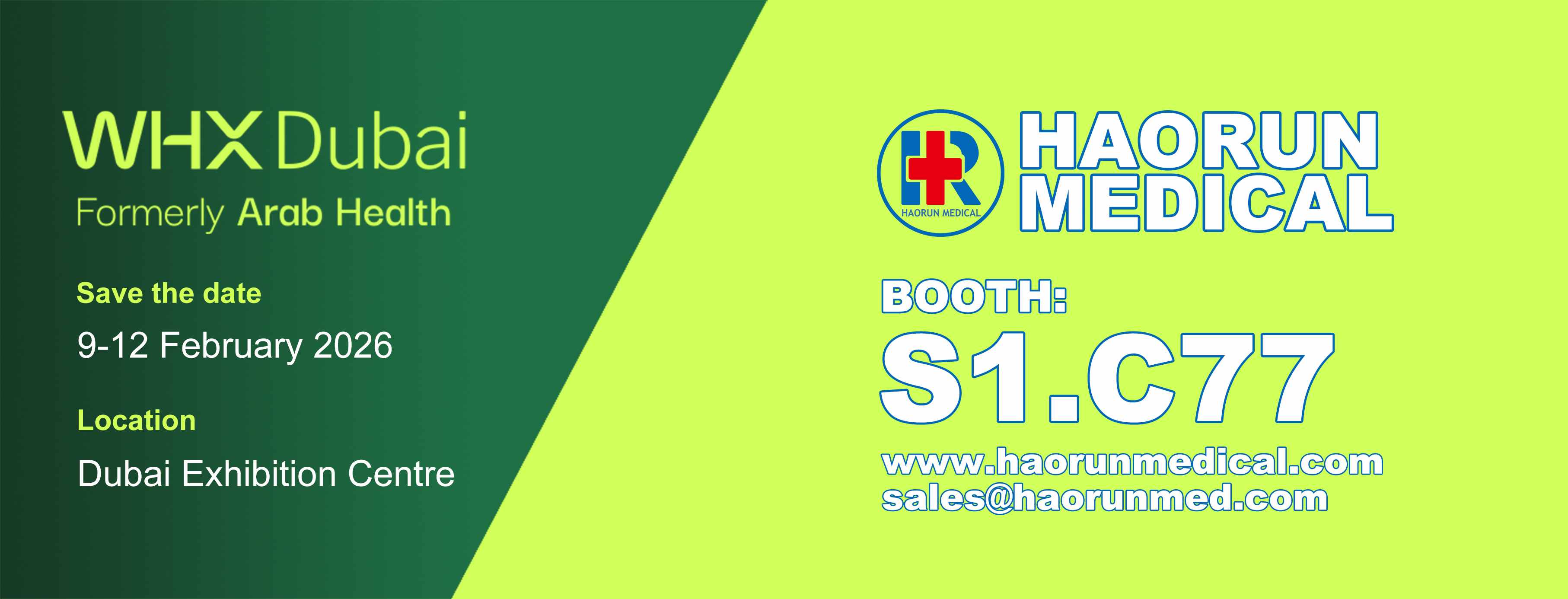Ó 9 Feabhra go 12, 2026, d'oscail an taispeántas WHX Dubai (Arab Health roimhe seo) a raibh súil leis go mór ag Ionad Taispeántais Dubai, ag tarraingt aird dhomhanda ón tionscal cúram sláinte. Mar mhonaróir gairmiúil earraí inchaite leighis, thaispeáin Haorun Medical Dressing Co., Ltd a tháirgí lárnacha ag mboth S1.C77, ag taispeáint cumais T&F agus caighdeáin cháilíochta na Síne san earnáil earraí inchaite leighis do cheannaitheoirí domhanda.